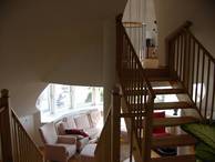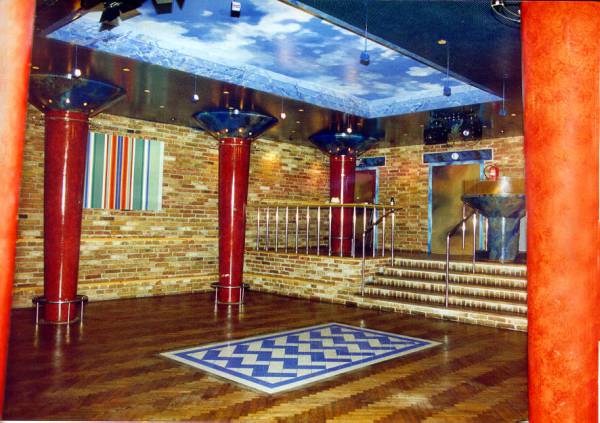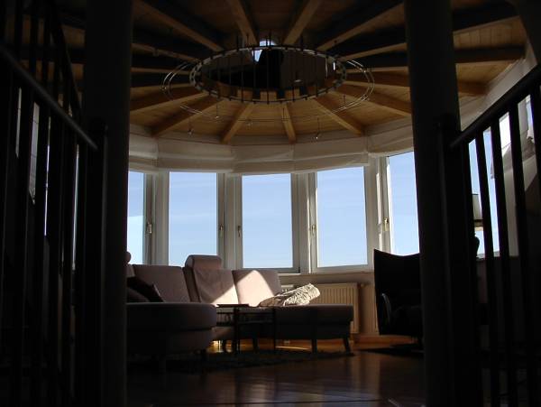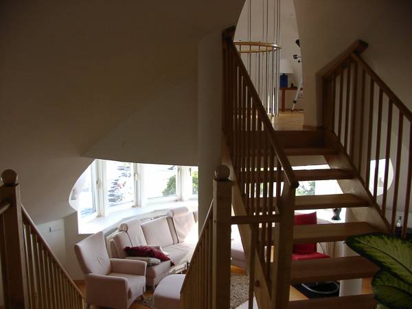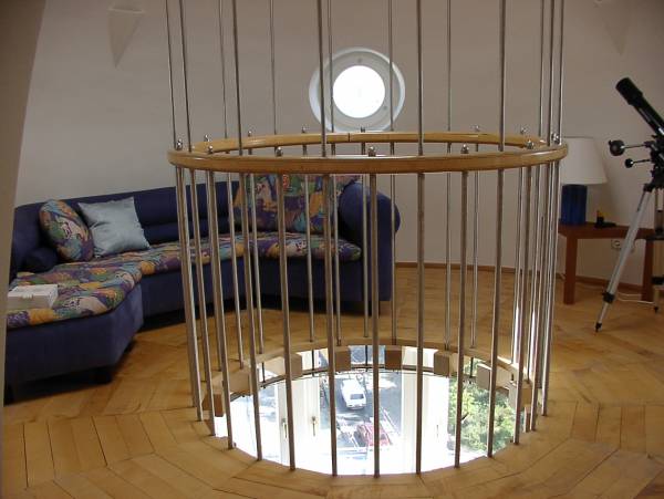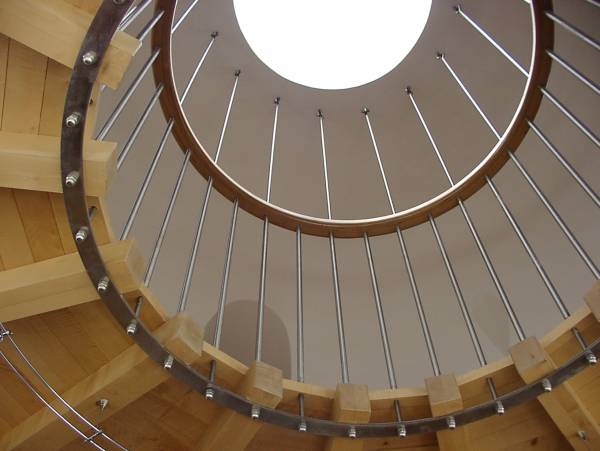 Der Innenhof wurde mit Hilfe von Kleinbaggern ausgeschachtet, das Kellermauerwerk teilweise unterfangen. Die konischen Säulen dienen neben konstruktiven Zwecken auch als Schallbrecher, Stehpult und Beleuchtung. Guter Schallschutz zum übrigen Haus, ausgezeichnete Akustik.