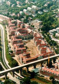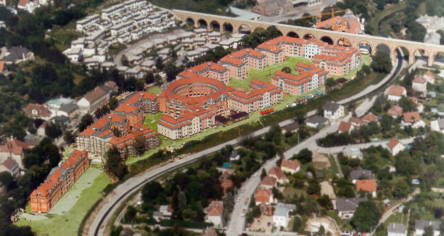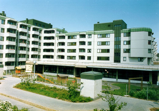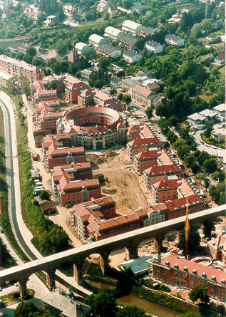 Wohnhausanlage mit ca. 350 WE gemeinsam mit Krier und Wachberger. Kleine intime Nachbarschaften öffnen sich zu einem gemeinsamen Hof. Trotz der Größe der Anlage wurden menschliche Proportionen gewahrt.