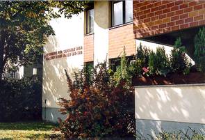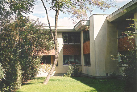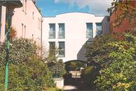 L-förmiges Haus, das mit einem Schenkel eine lange Feuermauer abdeckt. Das Stiegenhaus ist in der Ecke und von oben belichtet. Es ensteht ein intimer Gartenhof mit Spielplatz.