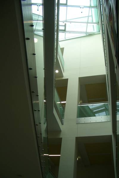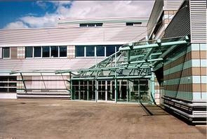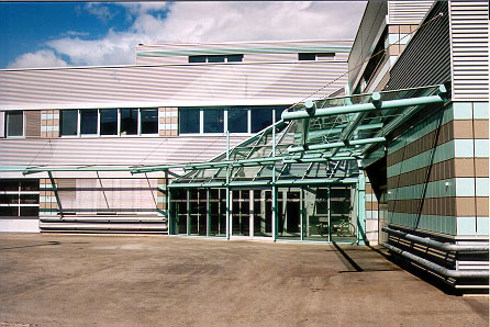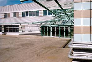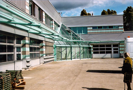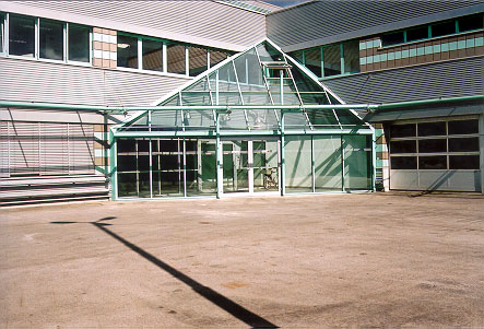 Kombiniertes Werkstätten- und Bürogebäude Lager im Keller, Werkstätten im EG, Büros im 1. Stock. Das Fensterband mündet teils ins Freie, teils ins Innere der Eingangspyramide