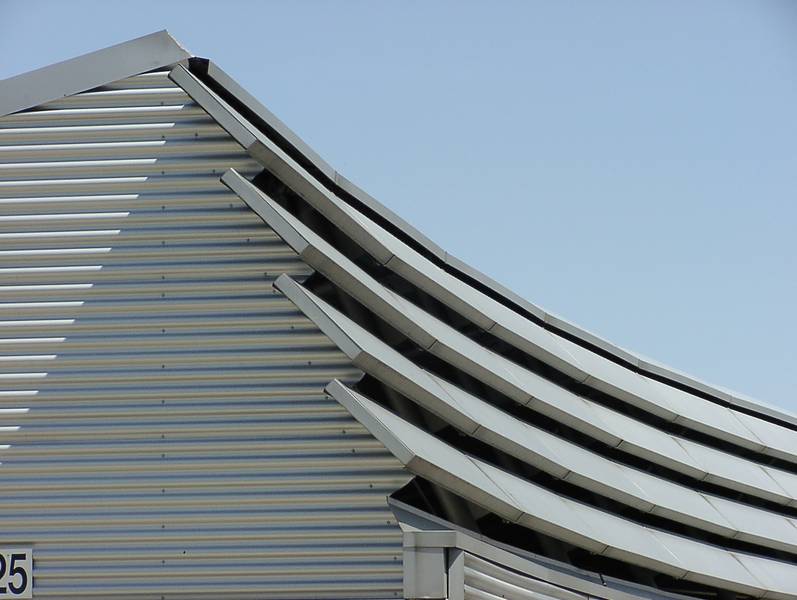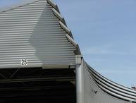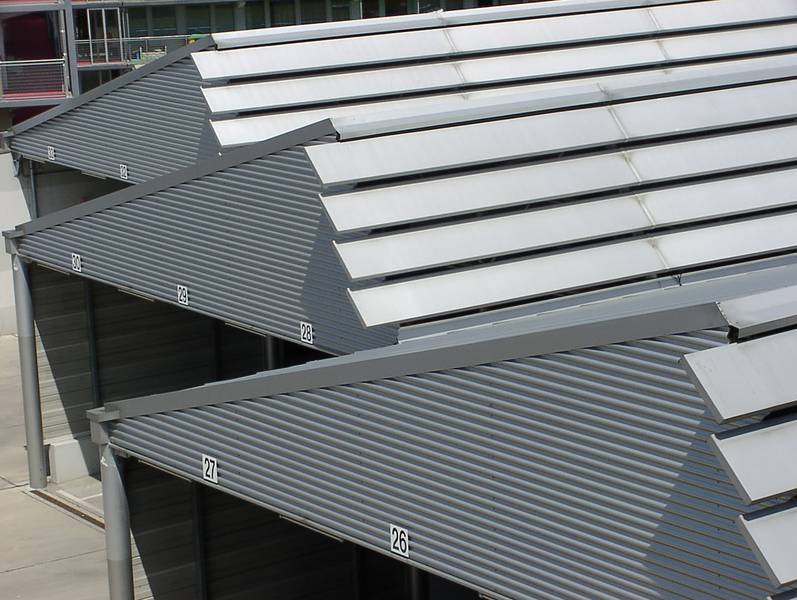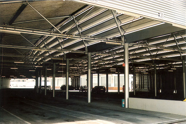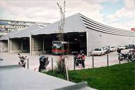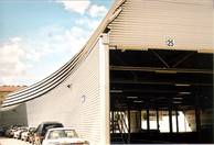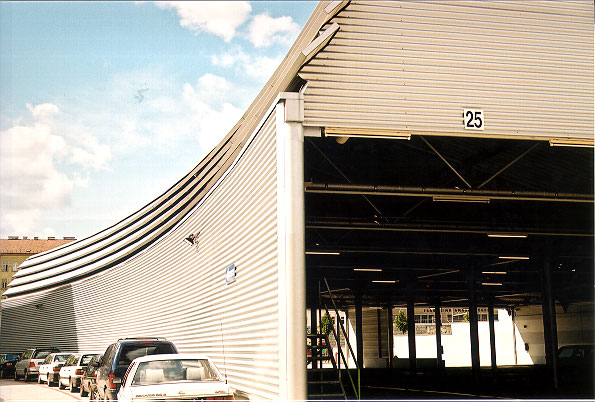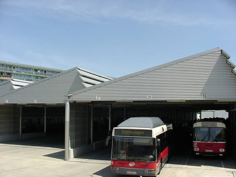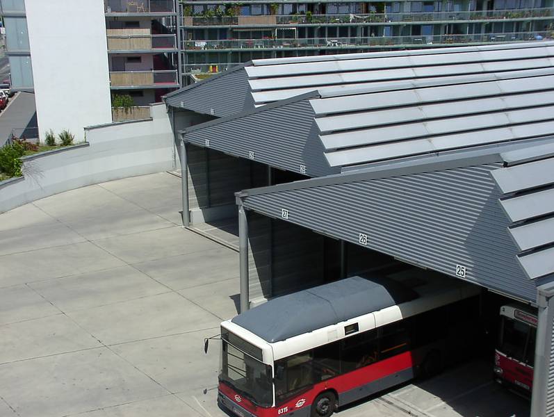 Garage für 80 Gelenkbusse. Anpassung an die unveränderbare Grundgrenze mit einer leichten Kurve, was der Halle etwas Eleganz verleiht. Keine beweglichen Lüftungen und Fenster am Dach, sondern Minimallösung mit offenen Lamellen. Der Kanal ist mit Flüssiggasschnüfflern.