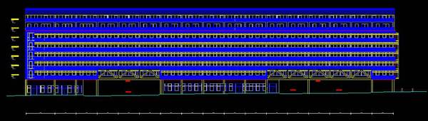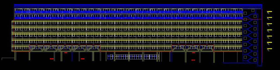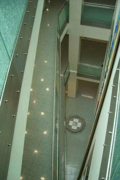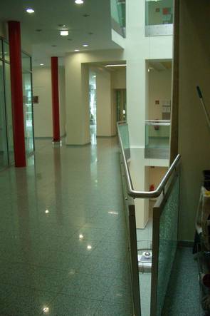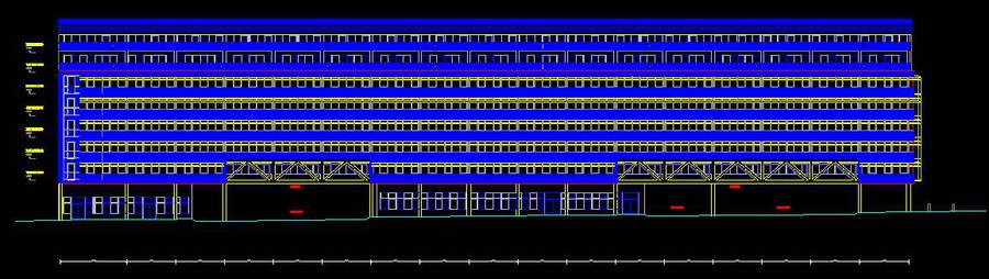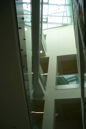 Über den Buseinfahrten befinden sich geschosshohe Fachwerkträger, auf denen die Bürogeschosse aufliegen.