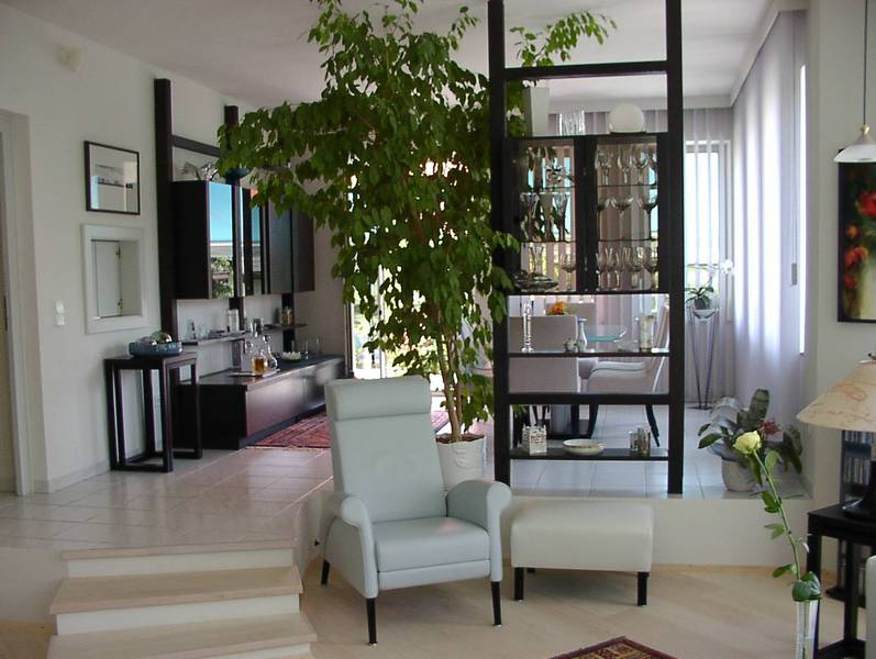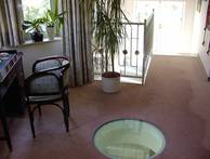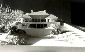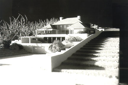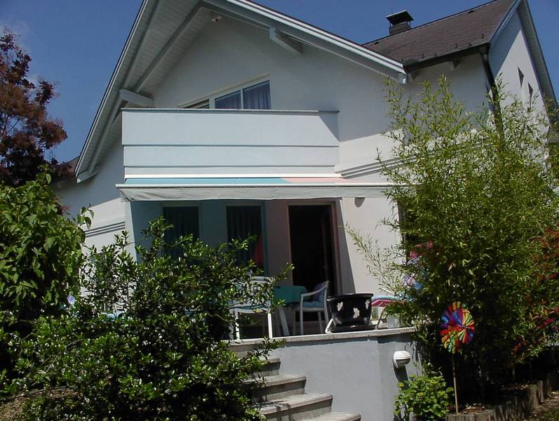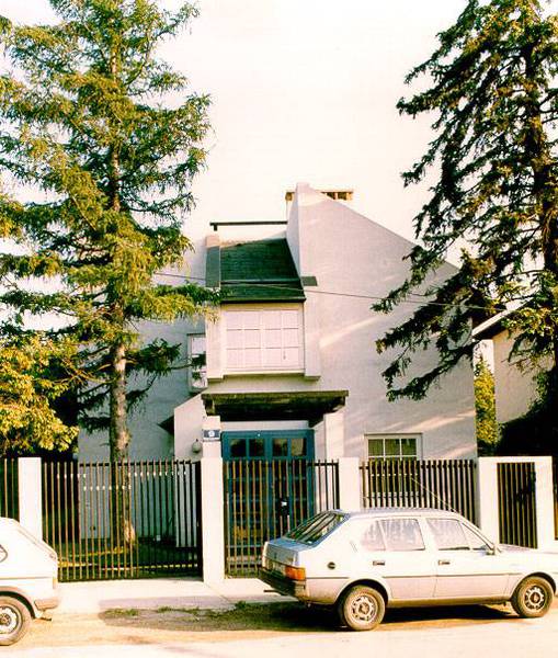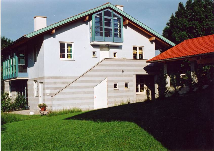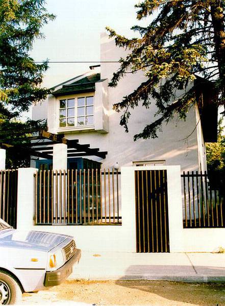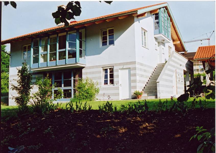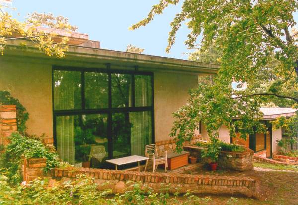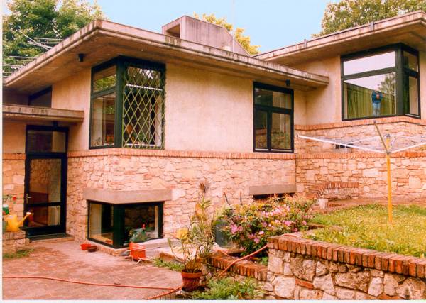 Die beiden Einfamilienhäuser folgen dem Gelände, das Strassenniveau ist 3 Geschosse unter dem Gartenniveau. Der Baugrund besteht aus Wellsand, daher wurde ein Plattenfundament gewählt. Die Mauerverkleidung ist aus Stein und Ziegel kombiniert ähnlich den Weingartenmauern der Umgebung.